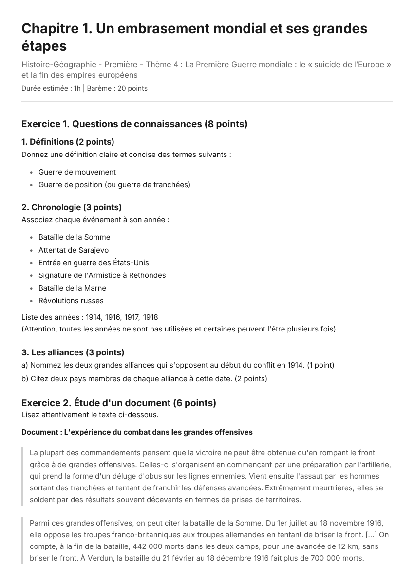 Votre réponse devra être structurée et s'appuyer sur des exemples précis vus en cours (plan Schlieffen, bataille de la Marne, implication des empires coloniaux, entrée en guerre de nouveaux belligérants).