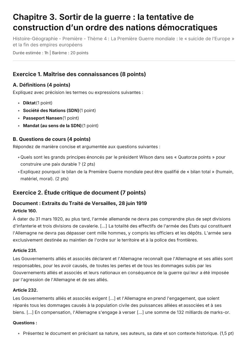 Votre réponse devra être structurée et comporter une introduction, un développement en deux ou trois parties et une conclusion. Vous pourrez notamment aborder les espoirs suscités par le wilsonisme et la SDN, les difficultés de l'application des traités de paix (1919-1923), et la poursuite des violences à l'Est (guerre civile russe, etc.).