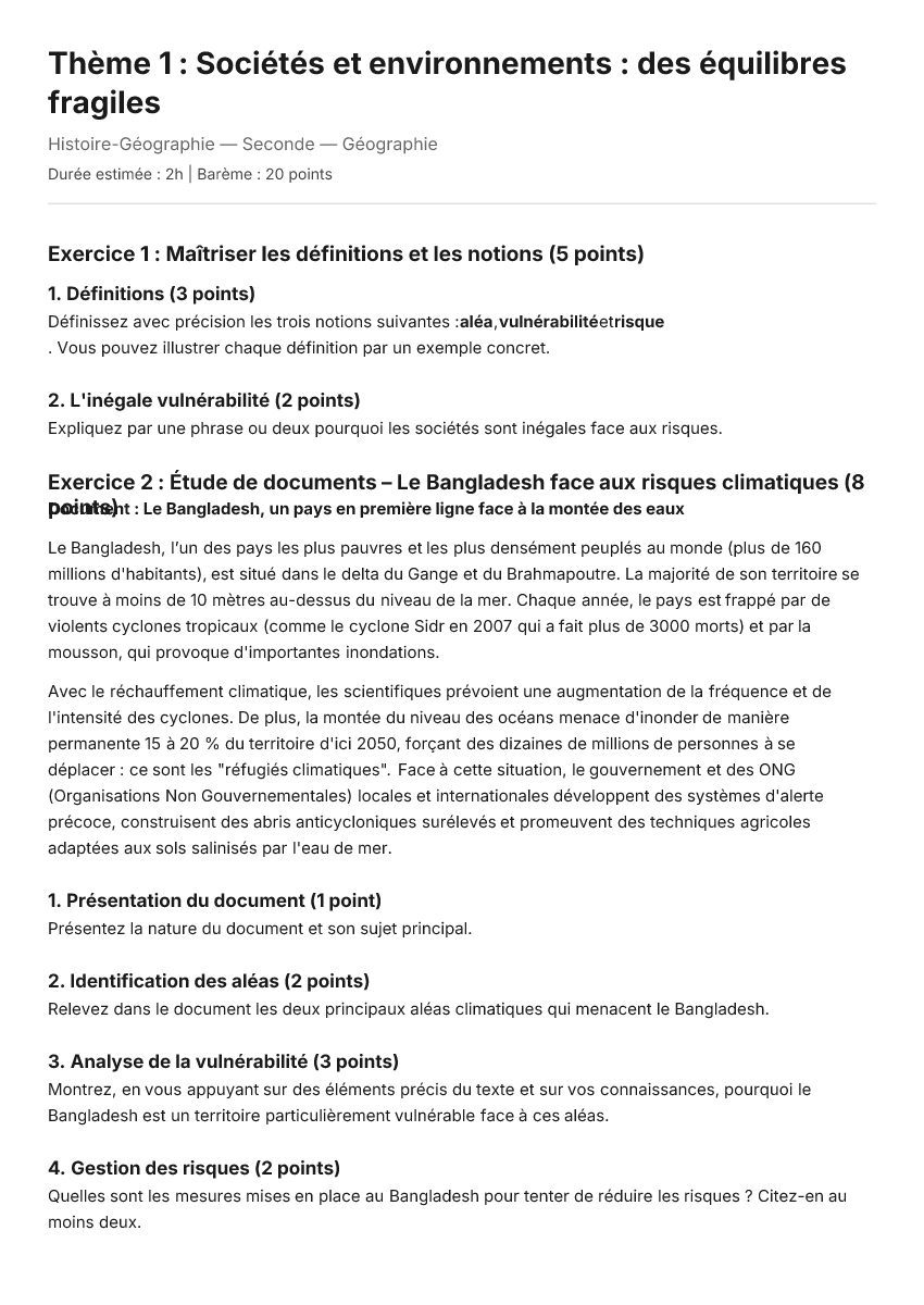 Exercice 2 : Étude de documents – Le Bangladesh face aux risques climatiques (8 points)