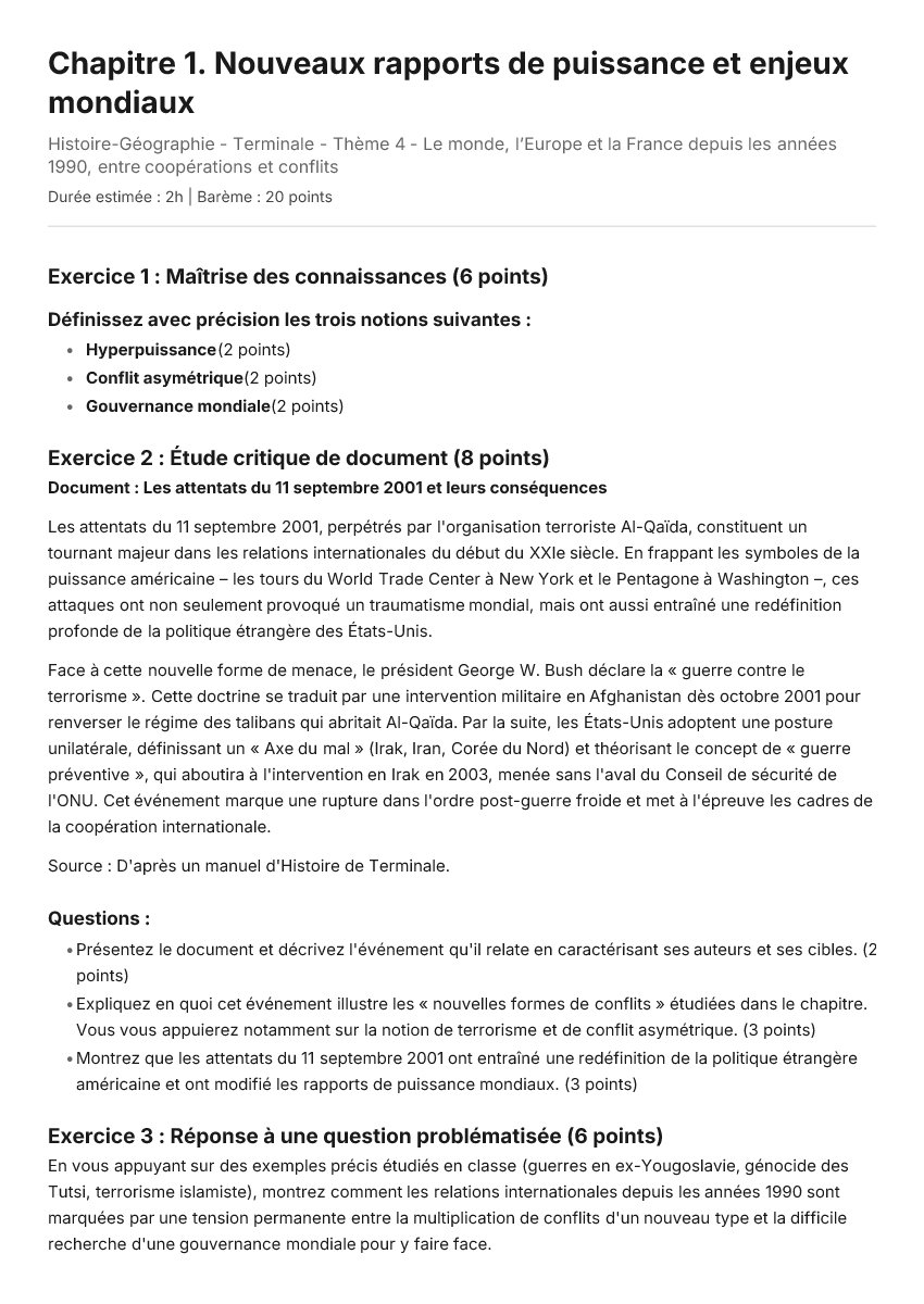 En vous appuyant sur des exemples précis étudiés en classe (guerres en ex-Yougoslavie, génocide des Tutsi, terrorisme islamiste), montrez comment les relations internationales depuis les années 1990 sont marquées par une tension permanente entre la multiplication de conflits d'un nouveau type et la difficile recherche d'une gouvernance mondiale pour y faire face.